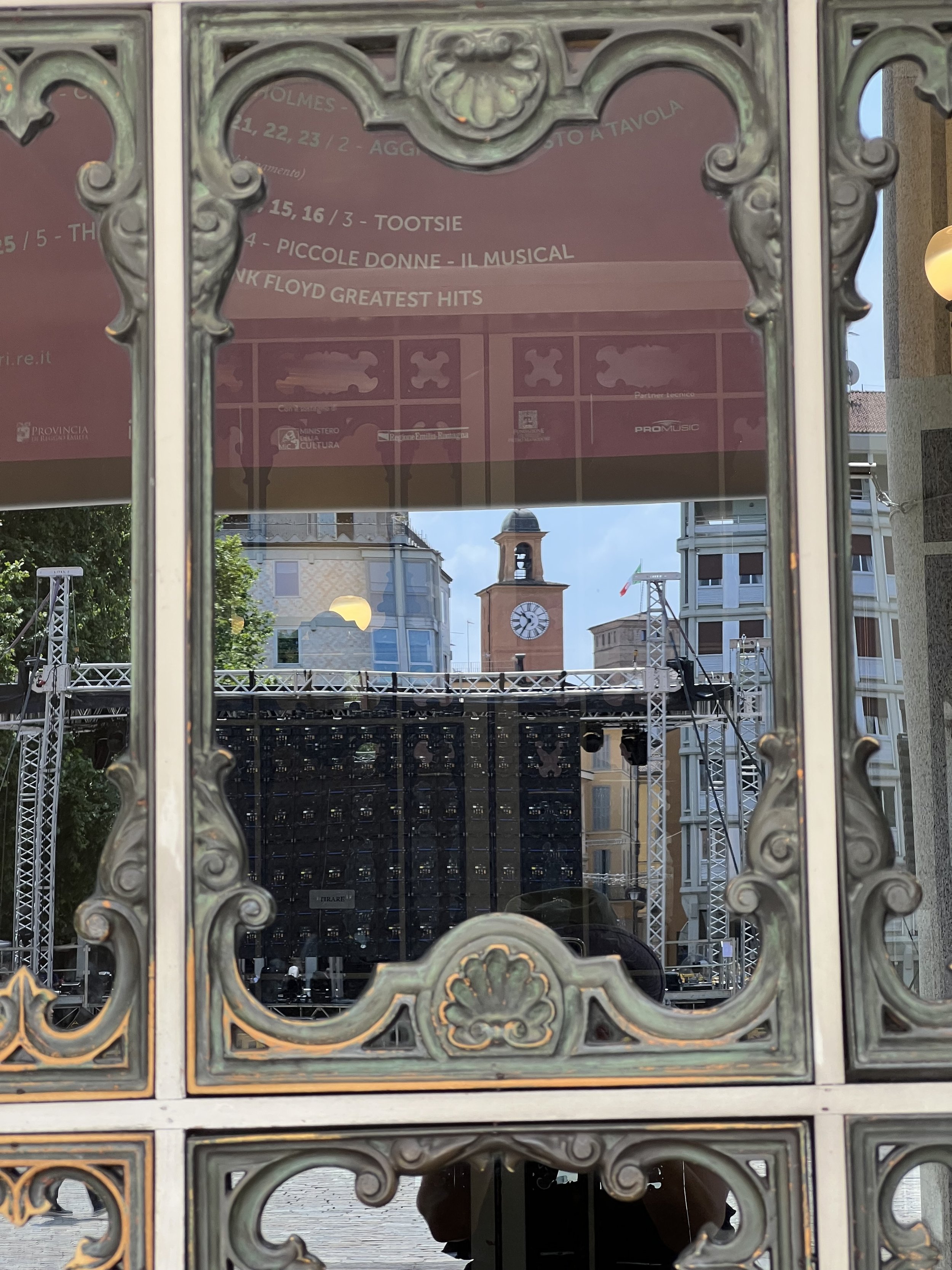 Reflection of the Reggio Emilia clock and bell tower from the doors of Il Teatro Valli.